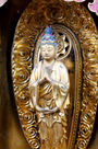 Inside this cabinet, we find a large, beautifully crafted kannon with a mustache, depicted with 1,000 arms. The face is serene; the closed eyelids hide glass eyes. Only two pairs of arms remain